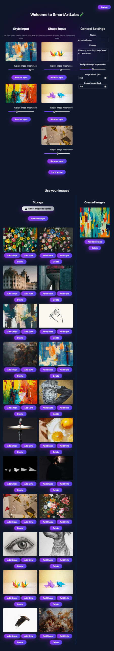 Im Endpoint wurden IP Adapter und Kontrollnet kombiniert. Das eine Modell nimmt als Input ein Bild welches die Form des Outputs festlegt der andere Input legt den Stil fest, welcher der Output haben soll. Wir haben dann mithilfe von Supabase ein User Management System angebunden, in welchem wir die Nutzer verwalten konnten. Festlegen konnten wer Zugriff auf das Tool bekommt, wer welche Bilder sieht, wer welche Bilder hochgeladen, wer welche Bilder generiert hat, etc.